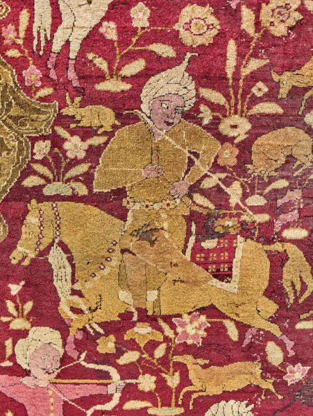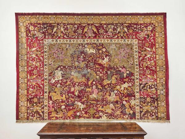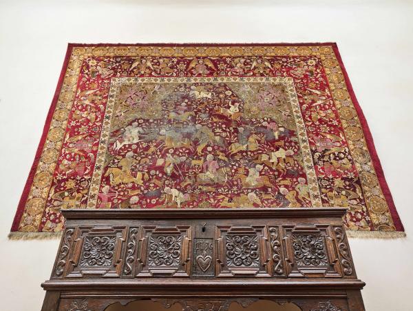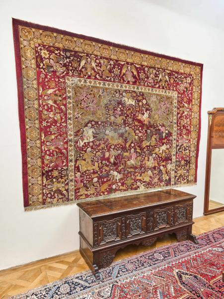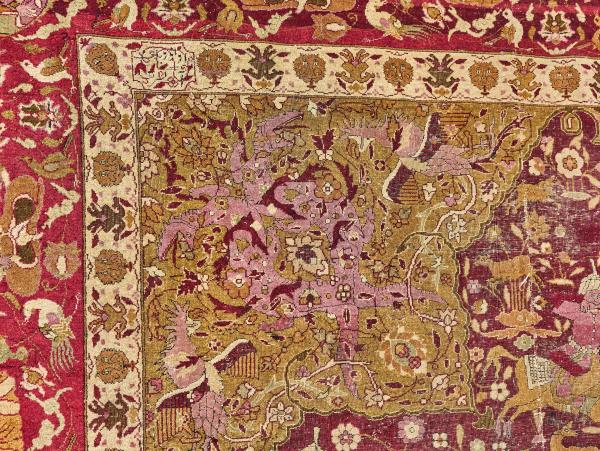 Fragment koberce z druhé poloviny 18. století. Koberec z Persie s loveckým motivem a bohatou bordurou s anděli. Vzácný kus, který je ideální k použití na zeď jako gobelín. Sběratelský kus - výborná investice. Provenience: Persie - Tabriz. Datace: druhá polovina 18. století.