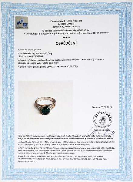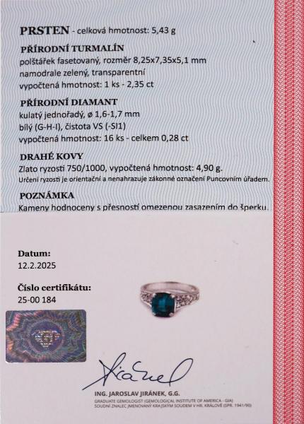 zlato o ryzosti 750/1000 I celková hmotnost 5,50 g I přírodní turmalín 1 ks 0,25 ct, rozměr 8,25×7,35×5,1 mm I přírodní diamanty 16 ks 0,28 ct, bílý (G-H-I), čistota VS (-SI1), průměr 1,6-1,7 mm I míry hlavy 6×7 mm I velikost prstenu 53 I osvědčení puncovního úřadu I certifikát z gemologické laboratoře je součástí šperku