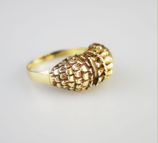 celozlatý prsten s šupinovým dekorem, Au 4,66 g/585/1000, Československo, kolem r. 1980, dobový punc (čejka), rozměr hlavy 2 x 1 cm; velikost prstenu 56