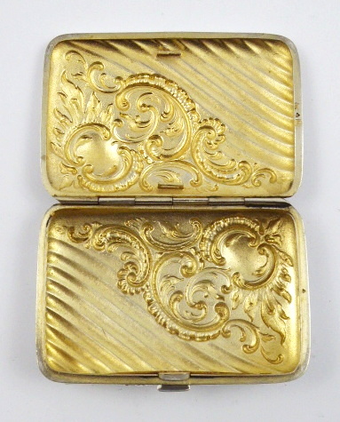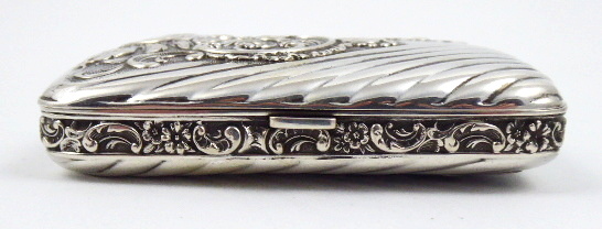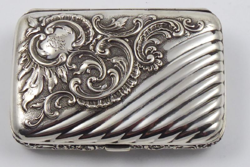 Německo 1888 - 1901. Stříbro, zlacené stříbro. V dekorativním stylu konce 19. století. Ryzost Ag 800/1000, celková hmotnost 58,65 g. Rozměr: 8,5 cm x 6 cm x 2 cm. Stříbrná krabička v dekorativním stylu konce 19. století zdobená reliéfními ornamenty rokaje, květin a vyklenutým šikmým žlábkováním (konvexní kanelury). Krabička je uvnitř zlacená. Značeno: německý punc koruna a půlměsíc a rakousko-uherský punc pro cizí zboží.