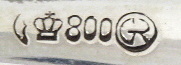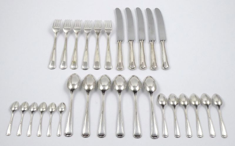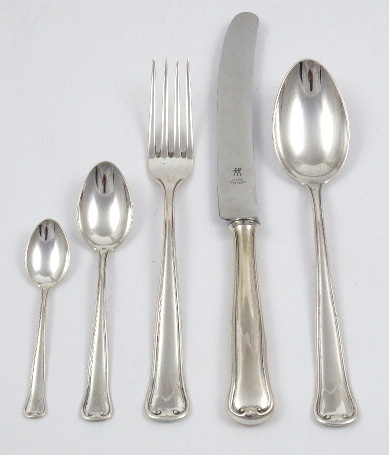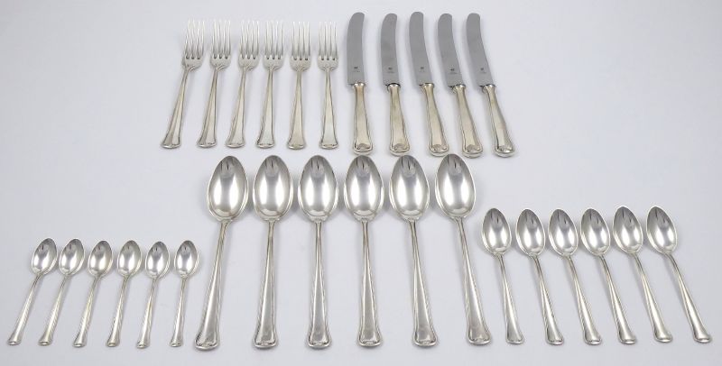 - GEBRÜDER REINER, KRUMBACH, Německo, Krumbach, od roku 1914. Stříbro, nerezová ocel. Ryzost Ag 800/1000, celková hmotnost 1.291,40 g. Přiloženo osvědčení Puncovního úřadu České republiky. Stříbrník: Gebrüder Reiner, Krumbach založeno roku 1910. Nerezová ocel od firmy Zwilling J. A. Henckels, Solingen. Délka lžic 20,5 cm, délka vidliček 20,5 cm a délka nožů 26 cm, délka dezertních nebo čajových lžiček 14 cm, délka moka lžiček 10,5 cm. Sada 29 kusů příborů pro 6 osob (chybí jeden nůž) z masivního stříbra zdobené reliéfními linkami. Nože mají čepele z nerezové oceli. Ve výborném stavu. Značeno: německý punc koruna a půlměsíc, ryzost 800 a mistrovská značka.