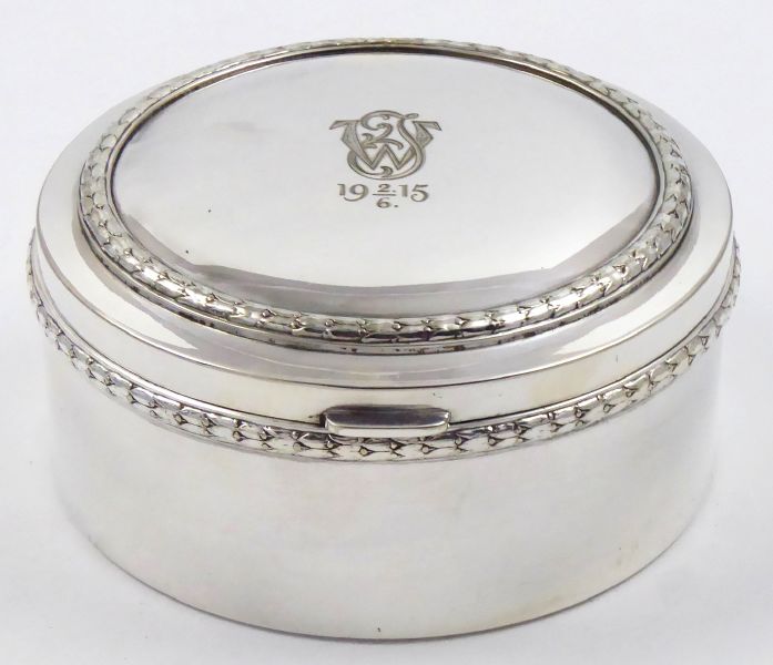 - ARTHUR KRUPP, BERNDORF, Rakousko-Uhersko, Berndorf, kolem roku 1915. Postříbřená mosaz - alpaka. Výrobce: Berndorfer Metallwarenfabrik Arthur Krupp. Průměr dózy 11,5 cm, výška dózy s víkem 6 cm. Celková hmotnost 328 g. Dóza z postříbřené mosazi dekorovaná po obvodu reliéfními věnečky. Na horní části víka uprostřed stylizovaný gravírovaný ornament s datací 2.6.1915. Ve výborném stavu. Značeno: značka výrobce a značka PRO ALPACCA-SILBER I.