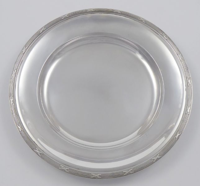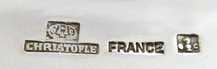 - CHRISTOFLE, FRANCIE, Paříž, od roku 1935. Postříbřený kov. Výrobce: slavná pařížská firma Christofle založená roku 1830. Celková hmotnost 1.402 g. Průměr 36 cm. Luxusní velký postříbřený kulatý tác s okraji zdobenými reliéfními linkami doplněnými o stylizované stužky. Ve velmi dobrém stavu. Značeno: jméno výrobce, firemní punc kvality (šachová figurka koně), FRANCE a mistrovská značka.