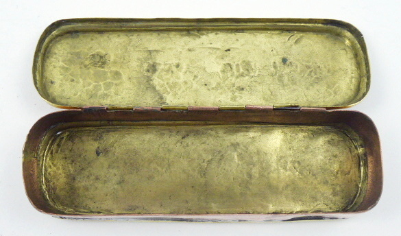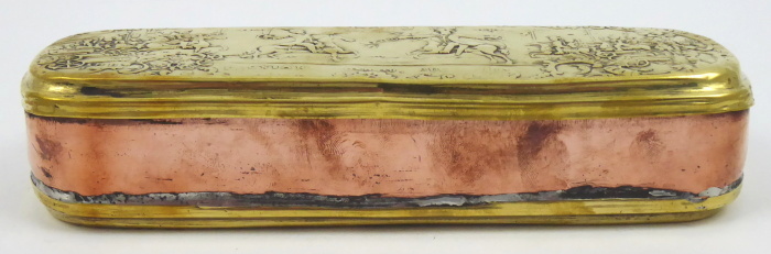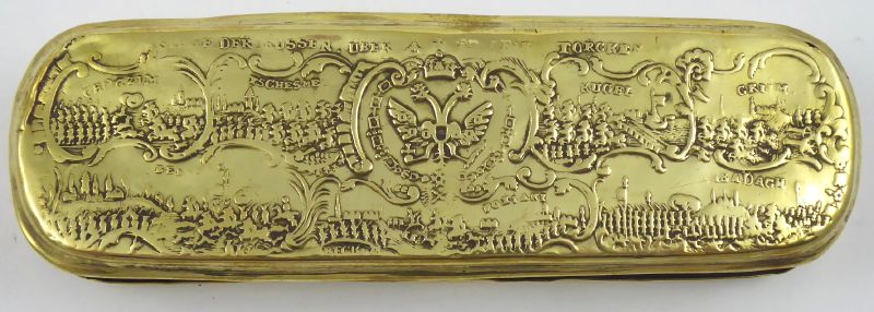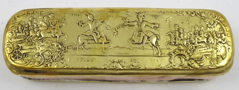 Rusko 1790 - 1810. Mosaz, měď. Období a styl: baroko. Rozměr: 16,5 cm x 5 cm x 3,5 cm. Barokní krabička s mosazným víčkem zdobená reliéfním figurálním motivem bitvy u Focsani (Rumunská Moldávie), jež se odehrála dne 1.8.1789. Mosazná základna zdobená vedutami měst a ruským carským dvouhlavým orlem. Boční strany měděné. Na víku vlevo signatura IHB.