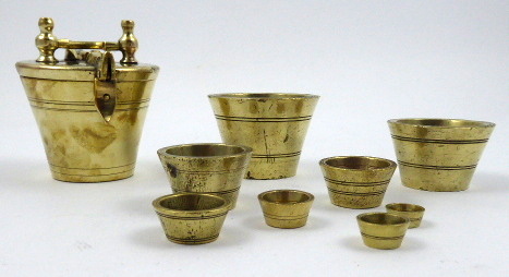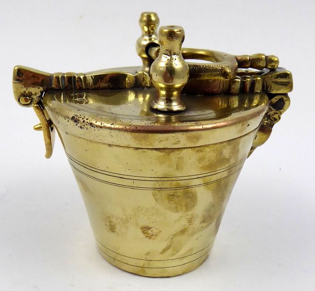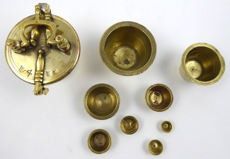 - 8 VÍDEŇSKÝCH LOTOVÝCH ZÁVAŽÍ, Rakousko 1740 - 1790. Mosaz či bronz. Celková výška v nerozloženém stavu 10 cm, průměr dózy 9 cm. Souprava osmi miskovitých lotových závaží. Tato závaží byla přesně kalibrována a používala se od pozdního středověku až do novověku především v obchodech a lékárnách. Název norimberská získala díky tomu, že právě město Norimberk bylo kdysi významným střediskem výroby váhových soustav a měřidel. Označení lotová znamená, že váhy byly odstupňovány podle tehdejší jednotky lot, což byl základní díl libry, jenž představoval cca 14 až 18 g. Tato souprava představuje sadu osmi závaží od nejlehčího po nejtěžší a díky miskovitému tvaru jsou složená do sebe a jsou vložená do základní dózy. Značeno a puncováno: rakouská dvouhlavá orlice, písmeno W (jako Wien) a čísla.