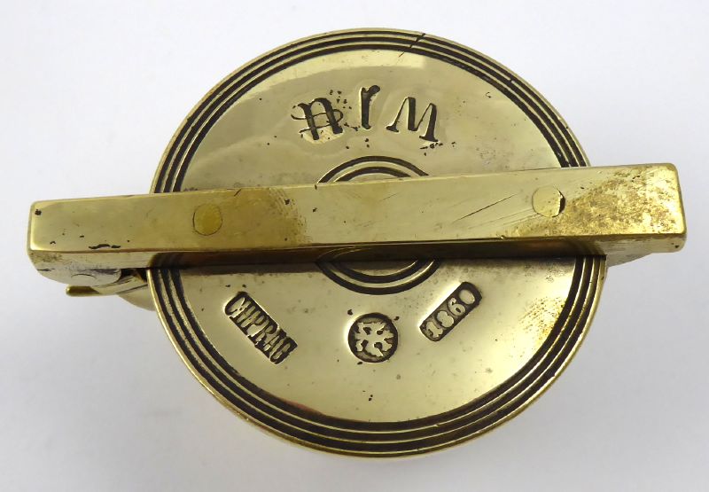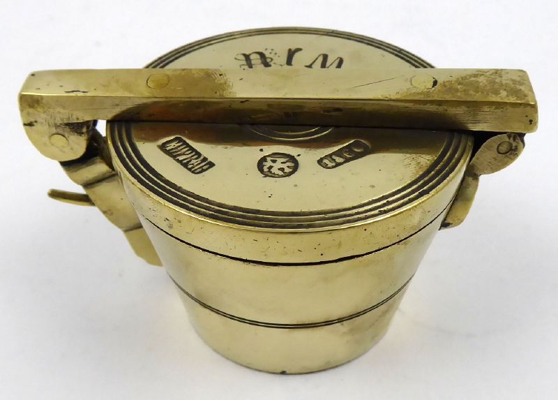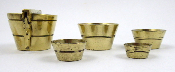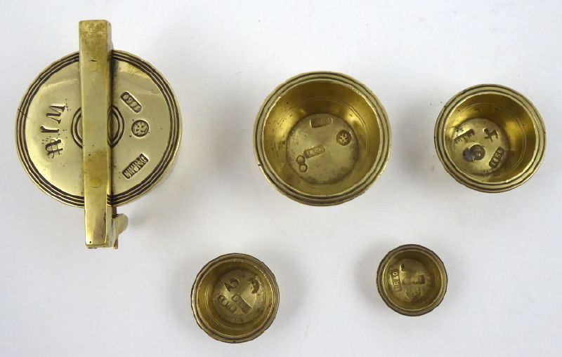 Rakousko-Uhersko, Praha, rok 1860. Mosaz. Celková výška v nerozloženém stavu 4,5 cm a celkový průměr 7,5 cm dózy, v níž jsou umístěna jednotlivá závaží. Přenosná sada čtyř miskovitých lotových závaží používaných zejména v obchodech a lékárnách. Označení lotová znamená, že váhy byly odstupňovány podle tehdejší jednotky lot, což byl základní díl libry, jenž představoval cca 14 až 18 g. Díky miskovitému tvaru jsou závaží složená do sebe a mohou tak být umístěna v jedné dóze, která byla praktická na jejich přenášení. Značeno a puncováno: letopočet 1860, PRAG, rakouská orlice, C. K. Prag, značka výrobce.