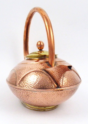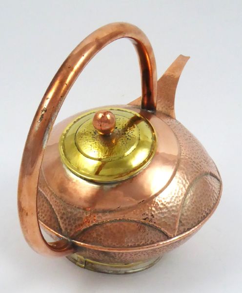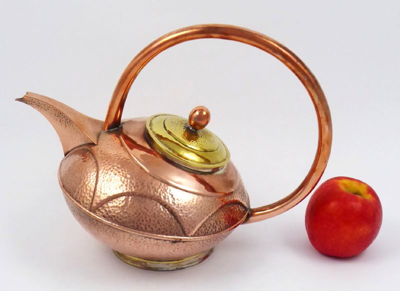Evropa 1920 - 1940. Měď, mosaz. Výška 25 cm, šířka 31 cm. Art deco ručně tepaná měděná konvice zdobená elegantním kladívkovým ornamentem s mosazným víčkem a základnou. Ve velmi dobrém stavu.