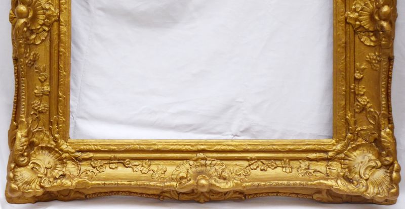 Francie nebo Střední Evropa 1850 - 1890. Dřevo ve zlatavě bronzové patině. Světlost (vnitřní rozměr) 51,5 cm x 56,5 cm. Rám francouzského typu blondel ve zlatavě bronzové patině bohatě zdobený velkými reliéfními ornamenty. V přední klenuté části dekorovaný prořezávaným motivem mušle.
