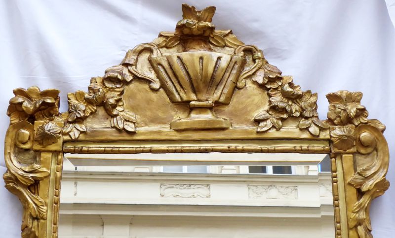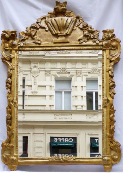 Střední Evropa 1700 - 1800. Dřevořezba s patinou, fazetové zrcadlo. Období a styl: baroko. Celkový rozměr zrcadla 111 cm x 76 cm. Velké zrcadlo s rámem raně barokního typu s bronzově zlatou patinou. Ve štítu horní části ústřední motiv velké vázy s květinovými girlandami. Po stranách rámu řezby s raně barokním ornamentem voluty. Dekorativnost doplňují florální motivy květů a v dolní části listy palmety. Zrcadlo fazetové.