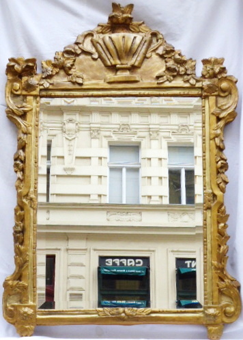 Střední Evropa, minulé století. Dřevořezba se zlacenou patinou, zrcadlo....