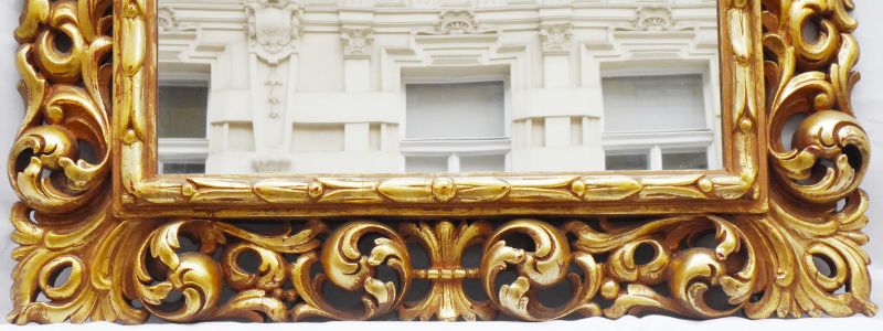 Střední Evropa, minulé století. Dřevořezba se zlacenou patinou, zrcadlo. Celkový rozměr zrcadla 67 cm x 57 cm. Dekorativní řezbované zrcadlo florentského typu se zlatou patinou. Bohatě zdobené reliéfním prořezávaným ornamentem akantu, rozvilin a listů. Zrcadlo vsazené uprostřed.