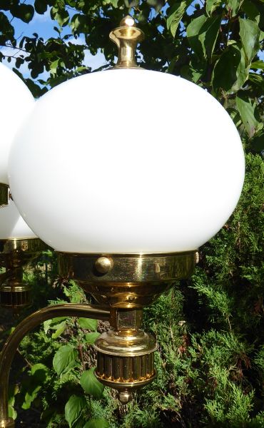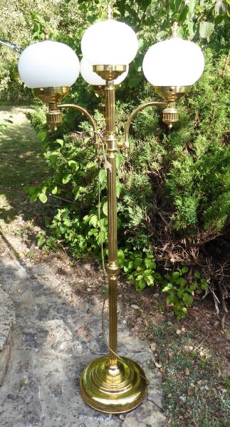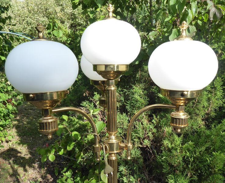 Československo, minulé století. Leštěná mosaz, bílé mléčné sklo. Výška 160 cm, horní průměr 60 cm, průměr základny 35 cm. Elegantní vysoká mosazná lampa se třemi horními klenutými tyčovitými rameny nesoucími svítidla z mléčně bílého skla. Zdobné krytky osvětlení ve tvaru kuželky. Sloupovité tělo s prstenci a žlábkovým konvexním ornamentem. Kruhová odstupňovaná základna. Ve velmi dobrém stavu. Nově elektrifikována, funkční.