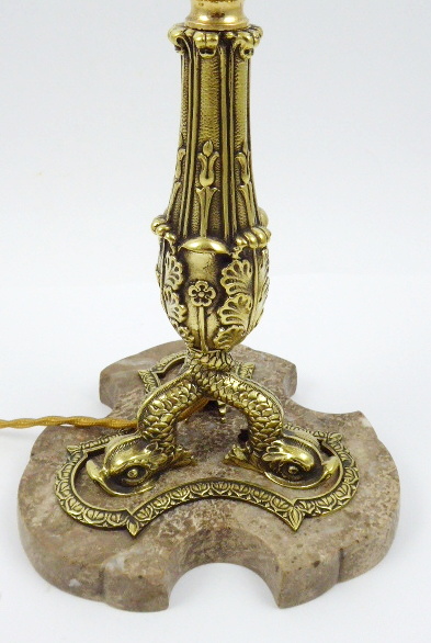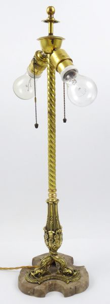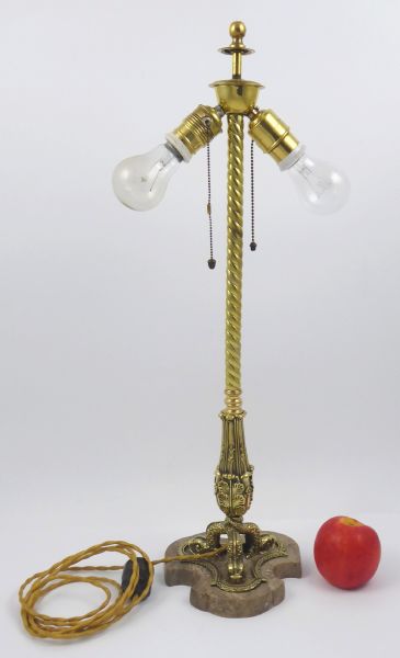 Střední Evropa 1890 - 1930. Mosaz, mramor. Výška 64 cm. Vyšší mosazná stolní lampa na dvě žárovky (svítidla). Tordovaný sloupek v horní polovině a v dolní dekorativní část zdobená reliéfním ornamentem zakončená trojnožkou se stylizovanými delfíny. Mramorová základna ve tvaru trojlistu. Ve velmi dobrém stavu. Nově elektrifikována, funkční.