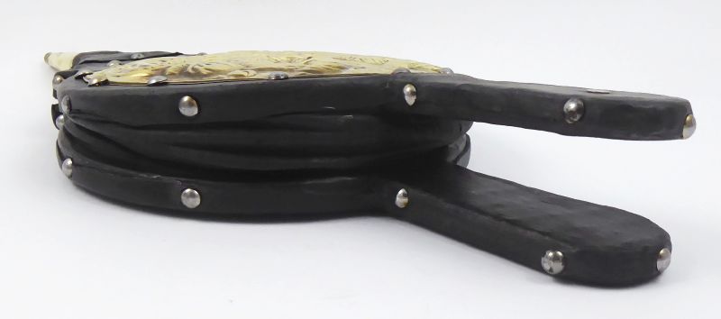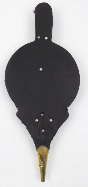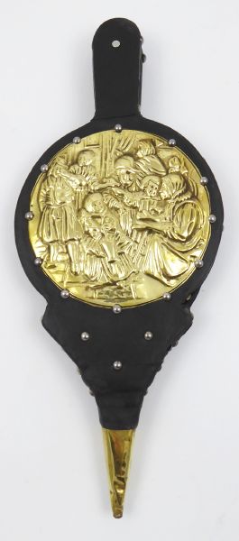 Evropa 1820 - 1890. Přírodní kůže, mosaz. Délka 53 cm, průměr 22 cm. Starožitné ruční krbové dmychadlo s koženým měchem s kovovými nýty a mosazným trychtýřovitým fukarem. Na čelní straně mosazný kulatý reliéf s figurálním námětem slavnosti.