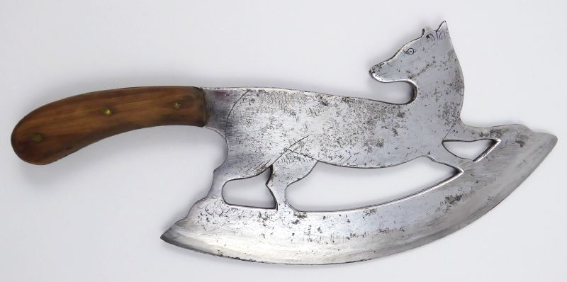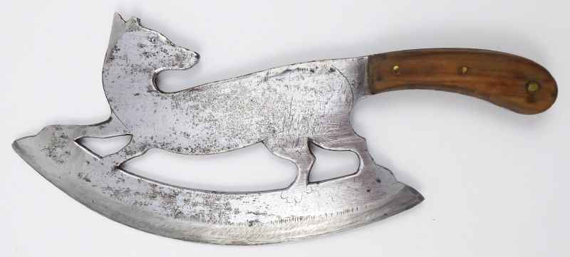 Čechy 1890 - 1940. Ocel, dřevo. Délka 30 cm, výška 13,5 cm. Ocelový sekáček se spodní částí ve tvaru kolébky zakončené ostřím. Figurální část sekáčku s motivem šelmy, dřevěné části držadla pak ve tvaru jejího ocasu. Zajímavý sběratelský kousek.
