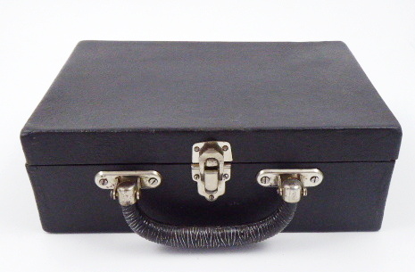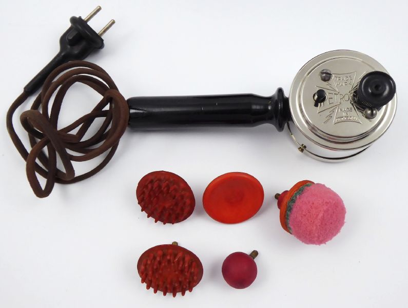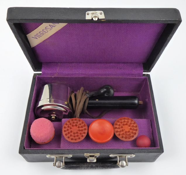 VIBROSAN S NÁSTAVCI, Československo 1920 - 1940. Bílý kov, bakelit, guma, dřevo, látka a molitan. Rozměr originální etue 25 cm x 17 cm x 9 cm. VIBROSAN byla značka elektrických masážních přístrojů, které se používaly na různé části těla. Sada v původním kazetovém kufříku obsahuje samotný přístroj z bílého kovu s vnitřním mechanismem a dřevěným držadlem s elektrickou šňůrou určenou do starého typu zásuvek. Set dále čítá různé druhy nastavitelných hlavic, s nimiž se po jejich upevnění do hlavního přístroje provádí samotná masáž. Většina vyměnitelných hlavic je z gumové pryže, dále ze dřeva či molitanu. Strojek značen: PETROSA CZECHOSLOVAKIA (pravděpodobně výrobce i exportér). Vše v dochované originální černé etui ve tvaru kazetového kufříku s kováním a vyloženého látkou s vnitřní etiketou s názvem VIBROSAN.