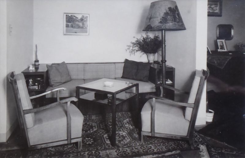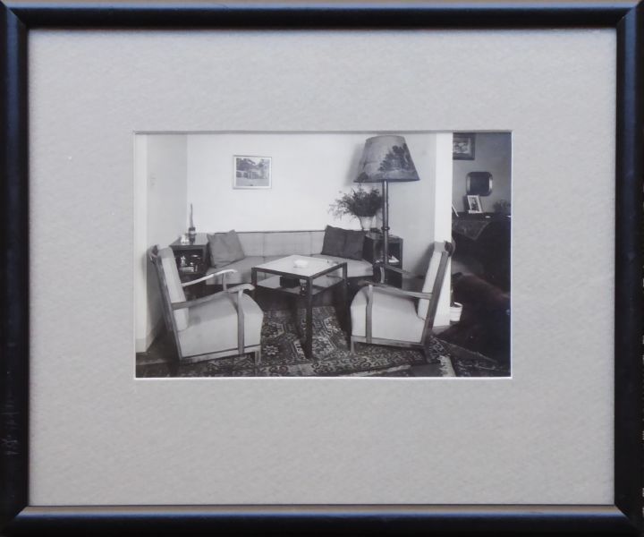 FOTOGRAFIE INTERIÉRU - NÁBYTKOVÉ SESTAVY Československo, 30. léta minulého století. Originální fotografie J. Sudka, pasparta, sklo, dřevěný rámeček. Josef Sudek (1896-1976) byl vnímán jako fotograf poetických zátiší, zahrad, melancholických zákoutí či krajin. Ale zejména ve třicátých letech minulého století působil i jako zakázkový reklamní fotograf. Spolupracoval například i se Spojenými uměleckoprůmyslovými závody v Brně a fotil i nábytek mimo jiné i návrhy slavného designéra Jindřicha Halabaly. Rozměr fotografie 11,8 cm x 17,6 cm. Celkový rozměr s rámem 23,5 cm x 28,5 cm. Černobílá fotografie interiéru se sedací soupravou složenou ze dvou křesel a pohovky se stolkem a vysokou stojací lampou s malovaným širmem a perským kobercem na podlaze. Na zadní straně fotografie razítko: FOTO SUDEK, PRAHA III, ÚJEZD 28. Ve dřevěném úzkém černě mořeném rámečku s paspartou a sklem.