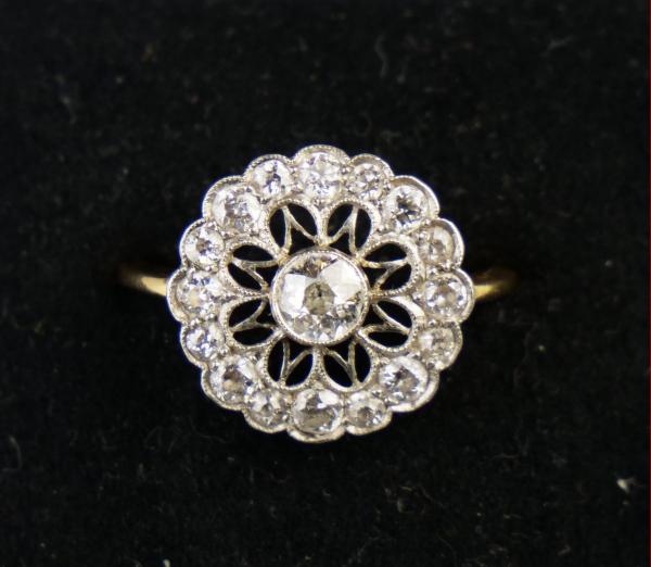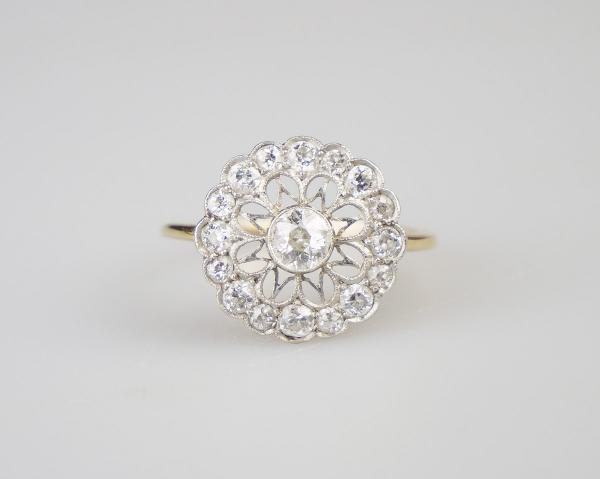 art deco zlatý prsten se 17 diamanty briliantového brusu o hmotnosti cca 1,2 ct, z toho centrální diamant o hmotnosti cca 0,35 ct, kameny v krajkově řešené hlavě zasazené v platině, Au+Pt btto 3,03 g/720+950/1000, západní Evropa, kolem r. 1935; atest Puncovního úřadu; velikost prstenu 59
