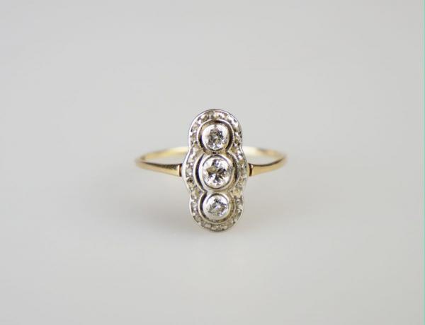 art deco zlatý prsten se třemi diamanty briliantového brusu o celkové hmotnosti cca 0,29 ct, kameny vsazené v platině, Au+Pt 1,30 g/540+950/1000, střední Evropa, kolem r. 1935, rozměry hlavy 0,7 x 1,4 cm; atest Puncovního úřadu; velikost prstenu 50