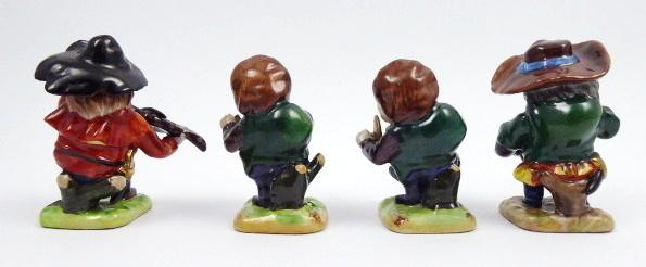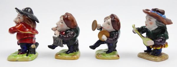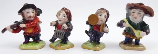Bílý, ručně barevně malovaný a mírně zlacený porcelán. Porcelánka Rudolstadt. Čtveřice porcelánových ručně barevně malovaných potulných muzikantů na reliéfních čtvercových podstavcích. Muzikanti v originálních kloboucích a čepicích hrající na loutnu, housle, činely či poklice a na valchu. Značeno zespodu: značka výrobce. Německo, Rudolstadt, minulé století. Výšky jednotlivých hudebníků: 9,5 cm, 9 cm, 8 cm a 8 cm.