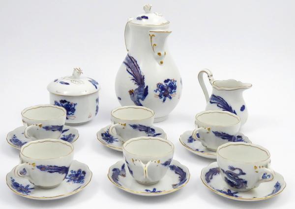 Bílý, ručně kobaltově malovaný a zlacený porcelán. Ve stylu porcelánky Míšeň. Karlovarský porcelán, závod Dubí. Moka servis složený z kávové konvice, konvičky na mléko, cukřenky a 6 šálků s podšálky. Bílý porcelánový servis s ručně kobaltovou modří malovanými čínskými draky doplněný o zlacené a červené ornamenty. Horní úchyty zdobené reliéfními květy. Kompletní kávový servis ve vynikajícím stavu. Značeno zespodu: značka výrobce, CZECHOSLOVAKIA, HAND PAINTED. Československo, Dubí, druhá polovina minulého století. Výška konvice 20 cm, výška konvičky na mléko 9 cm, výška cukřenky 9 cm, výška šálků 4 cm, průměr podšálků 10,8 cm.