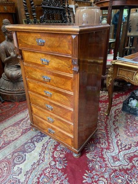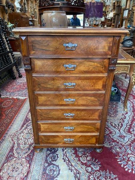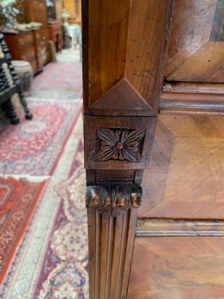 bohatě zdobená intarziemi, sklopná psací deska, zásuvky, ořech, kořenice