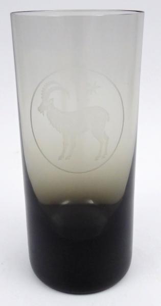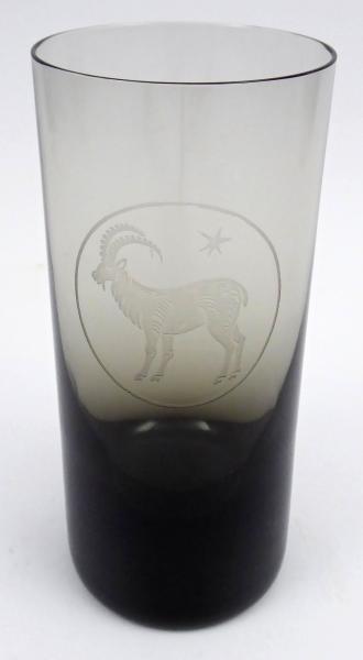 Kouřové sklo, lept. Sklárna Moser. Sklenice z kouřového skla kulovitého tvaru s těžkým dnem a leptaným medailonem se znamením zvěrokruhu Kozoroh. Ve výborném stavu. Značeno zespodu: leptaná oválná značka Moser. Československo, Karlovy Vary 1970 - 1990. Výška 16,7 cm.