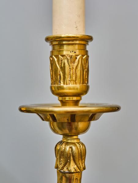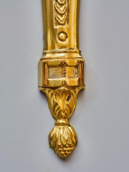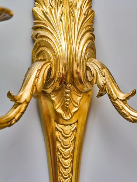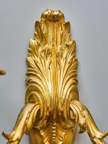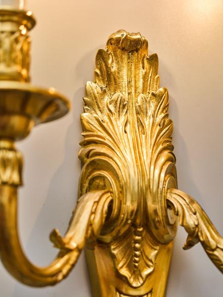Starožitná nástěnná lampa / aplika z lité mosazi v klasicistním stylu s florálním zdobením. Robustní tělo s velkým akantovým listem, z kterého vycházejí dvě prohnutá ramena nesoucí objímky s žárovkami. Na první pohled zaujme kvalitní provedení ve zlaté barvě s jemnými detaily. Lampa je plně funkční a ihned k užívání. Lampa je na dvě žárovky s klasickým svíčkovým závitem E14 do 40W - vhodné jsou normální, halogenové i lede žárovky do 40W, které nejsou součástí, ale můžeme dodat nebo doporučit nejlepší volbu pro váš projekt.