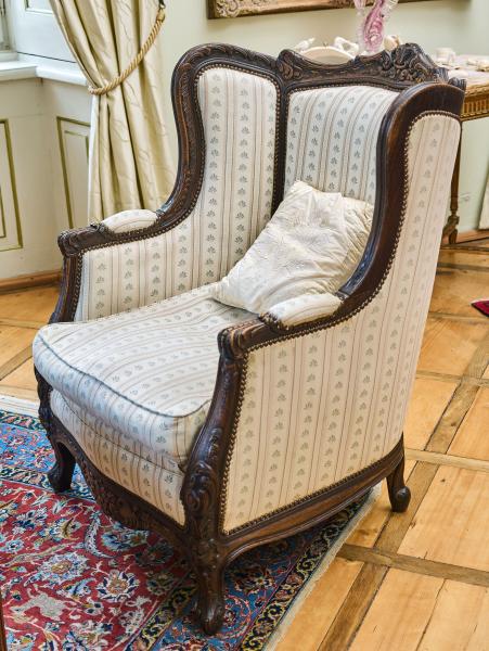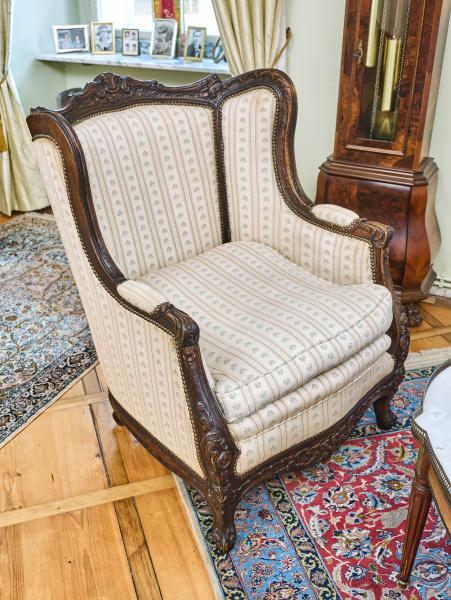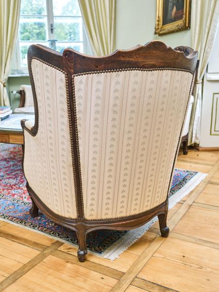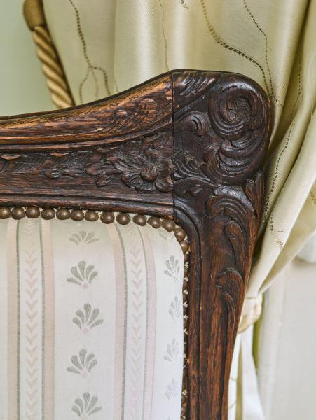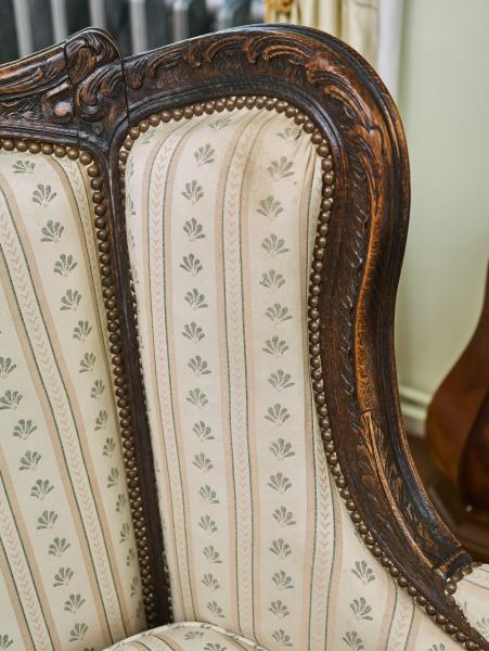 Ručně vyřezávaná sedací souprava ve stylu Ludvíka XV. Tato luxusní souprava je vyrobena z masivního dubu, sedáky jsou vyplněny jemným peřím a látka je zakončena ozdobnými hřebíčky. Vysoké opěradla s ušima. Sedací souprava je velmi pohodlná. Sedáky jsou volné a mají pratelný potah. Celá konstrukce je velmi bytelná. Stav: velmi dobrý, bez červotoče, ihned k užívání. Datace: druhá polovina 19. století. Provenience: Francie.