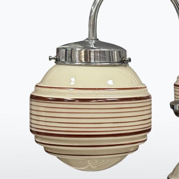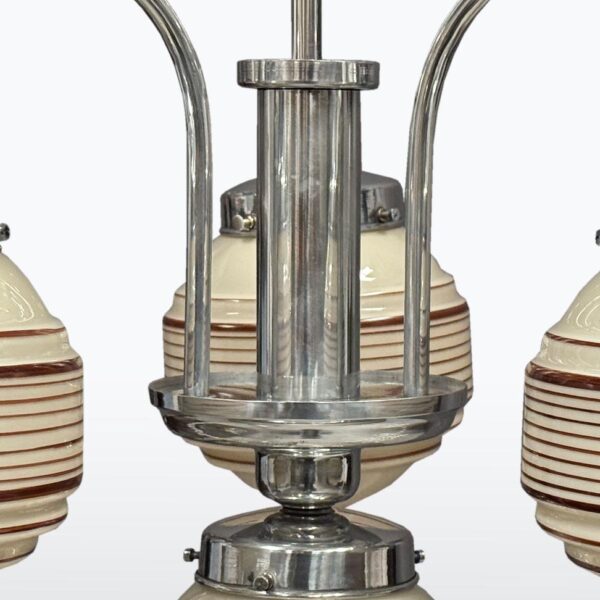 Lehkost hliníkového rámu dodává lustru moderní charakter a je zajímavým příkladem využití nových materiálů v meziválečném designu.