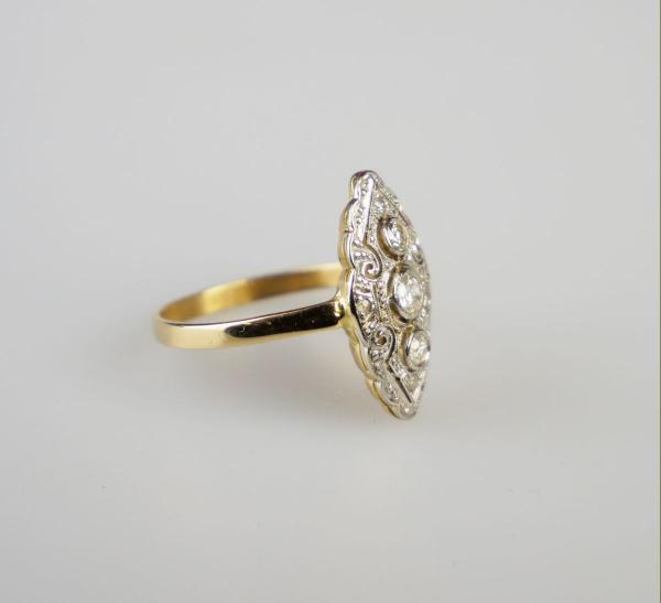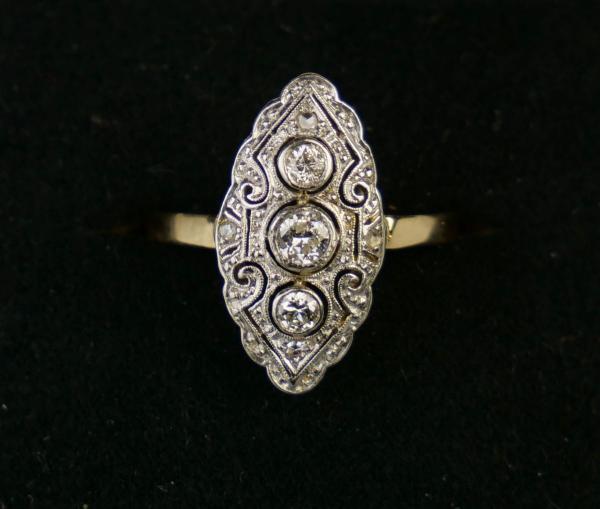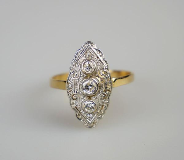 art deco prsten ze žlutého (šína) a bílého zlata (hlava) se 3 diamanty kruhového briliantového brusu o celkové hmotnosti cca 0,22 ct a s několika diamantovými routami, Au 2,17 g/585/1000, západní Evropa, kolem r. 1935; rozměry hlavy 1,85 x 1 cm; atest Puncovního úřadu, znalecký posudek; velikost prstenu 50,5