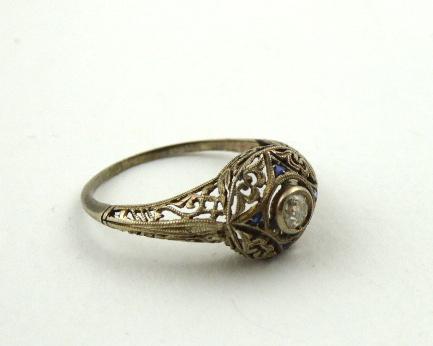 Osmnáctikarátové bílé zlato, přírodní diamant o váze 0,15 ct, čtyři přírodní malé safíry. Ryzost Au 750/1000, celková hmotnost 1,85 g. Prsten z bílého osmnáctikarátového zlata s centrálním přírodním diamantem starého briliantového brusu o váze 0,15 ct, barva I, čistota SI3 a čtyřmi malými přírodními safírky. Mistrovská šperkařská práce s jemně prořezávanými ornamenty. Značeno: československý punc kohout. Evropa, kolem roku 1900. Velikost 56.