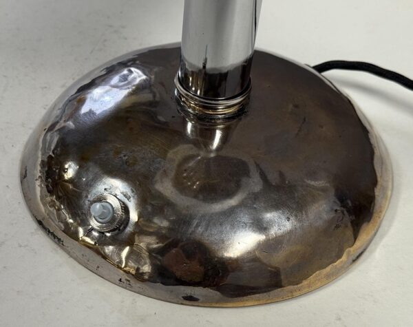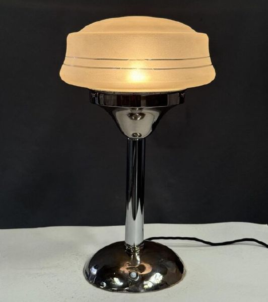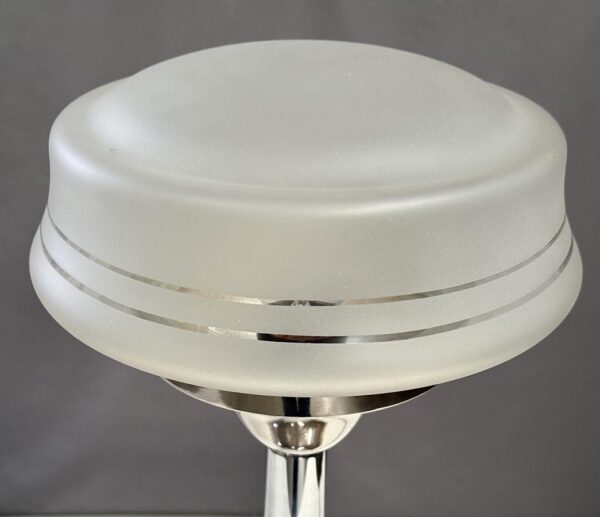 Období: 30. léta 20. století, chromovaný kov, původní kovový podstavec, pískované sklo se linkami, stav: původní podstavec byl poškozen, ale odborně zachráněn; nová elektroinstalace