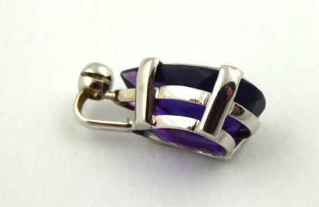Osmnáctikarátové bílé zlato, přírodní ručně broušený velký ametyst, přírodní ručně broušený malý diamant. Ryzost Au 750/1000, celková hmotnost 3,9 g. Přívěsek z osmnáctikarátového bílého zlata s centrálním přírodním ametystem uprostřed ve tvaru kapky s oboustranným výbrusem doplněným v horní části přírodním diamantem o váze 0,05 ct, barva H, čistota SI. Značeno: československý punc kohout, ryzost 750, mistrovská značka. Itálie, třetí třetina minulého století. Rozměr přívěsku výška 20 mm, šířka 12 mm.