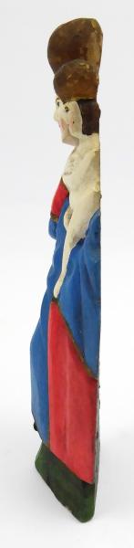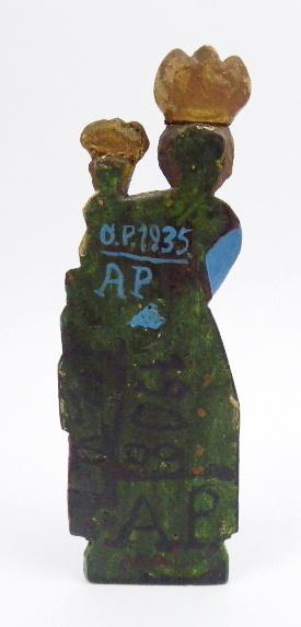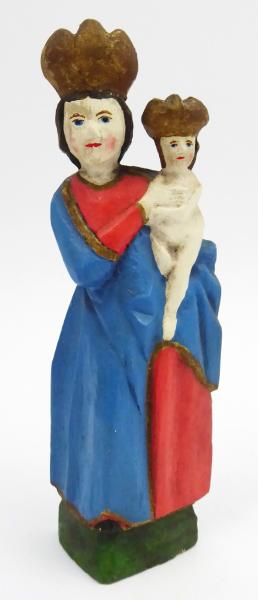 Socha stojící Panny Marie s nahým Ježíškem na levé ruce je zpodobněním Panny Marie Svatohorské. Madona je oblečená v červených šatech a modrém plášti. Obě postavy jsou korunovány. Na jednoduchém zeleném podstavci. Zadní strana plochá a na ní ručně psaný modrý nápis O. P. 1935 a písmena AP. Čechy, rok 1935. Výška 21 cm.