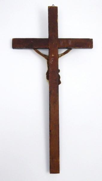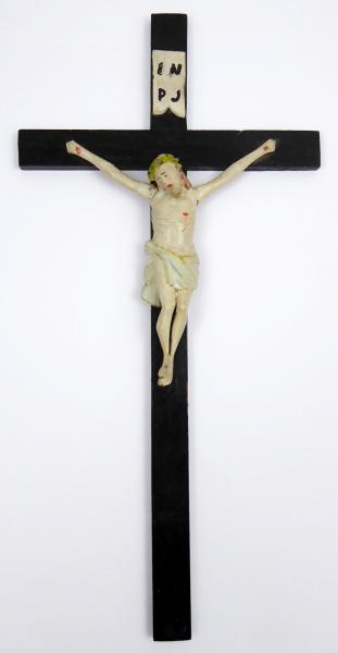 Dřevořezba, polychromie, patinováno. Přiloženo osvědčení Národního památkového ústavu České republiky. Vysoký krucifix se z běžného pojetí vymyká umístěním titulu s písmeny IN/PJ. Hlava Ježíše s velmi drobným tělem je skloněná k pravému rameni a rána umístěna vlevo na hrudi je vyznačena červeně. Bederní rouška (perizonium) krémové barevnosti je uvázána na pravém boku. Dřevěný kříž černé barvy je lakovaný. Nahoře na zadní straně kříže oko na závěs. Střední Evropa 1900 - 1940. Výška 65 cm.