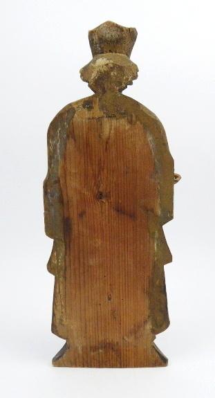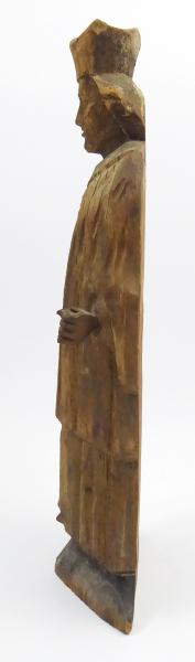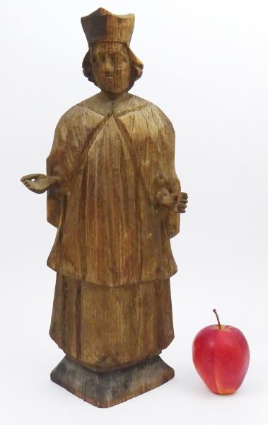 Dřevořezba. Přiloženo osvědčení Národního památkového ústavu České republiky. Dřevěná socha stojícího svatého Jana Nepomuckého v liturgickém oděvu, rocheta a almuce, s biretem na hlavě. Ruce zachycené od zápěstí po konce prstů byly vyřezány samostatně a poté nasazeny na čep. Dřevořezba byla umístěna v exteriéru ve výklenku (nice) a povětrnostními vlivy byla zbavena polychromie. Tato patina prostého dřeva je velmi působivá. Zadní strana sochy je plochá. Střední Evropa 1885 - 1895. Výška 44 cm.