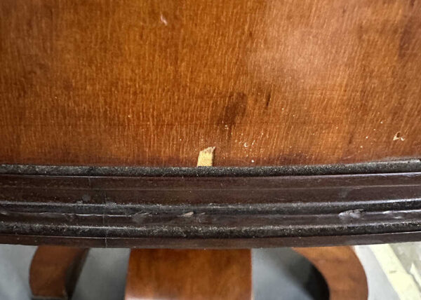 Původní stav – znatelné stáří, chybějící kousky dýh na desce stolu, uražené lištičky apod.