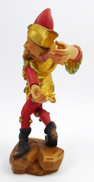 Dřevořezba, polychromie, zlacení. Kopie ze série slavných Moriskentänzer (tanečníků Morrisova tance). Autor originální předlohy: Erasmus Grasser (1450-1518) slavný německý pozdně gotický řezbář, sochař a architekt. Jeho nejznámějším, světově proslulým, dílem jsou právě tito tanečníci. Sérii v originálu vysokých soch z lipového dřeva vytvořil pro taneční sál Staré radnice v Mnichově. Název figury: Zattelrock (špičatá sukně) - Tanečník ve špičaté sukni. Výrobce: Řezbářství J. Heinrichmeyer, Rimbach, Německo. Dřevořezba tanečníka ve vysoké čepici oblečeného do zlatavého oděvu se sukní se špicemi. Červené punčochy s rolničkami i stejně barevné rukávce a černé dobové špičaté boty. Na stylizovaném reliéfním podstavci. Německo, Rimbach, minulé století. Výška 25 cm, rozměr podstavce 10 cm x 8,5 cm.