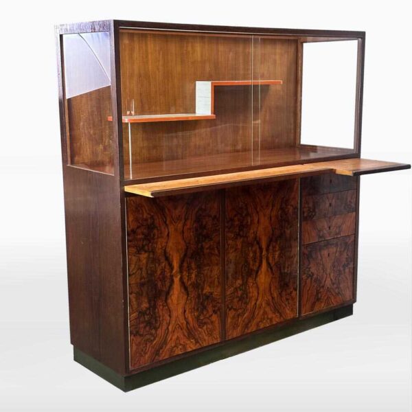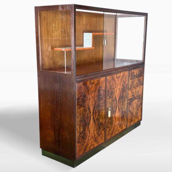 vyrobeno z materiálů: dýha dubová, dýha ořechová, chrom, ocel, sklo