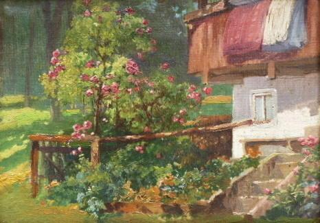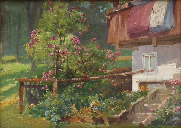 Olej na plátně fixovaném na kartonu 19,5 cm x 26,5 cm. Nesignováno. Vzadu tužkou psané jméno autora. Olejomalba zachycující jeden idylický letní den u domku na okraji lesa s peřinami přehozenými přes zábradlí na dřevěné verandě a se zahrádkou plnou keřů s růžemi. Ve zlatém originálním klenutém rámu klasicistního typu. Německo 1907 - 1910. Celkový rozměr s rámem 33 cm x 40 cm.