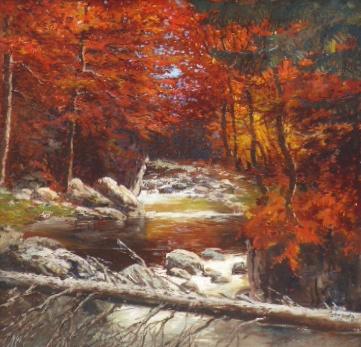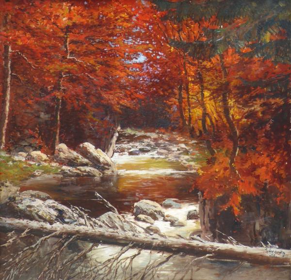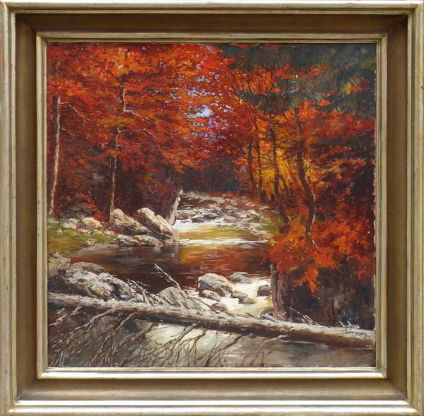 Olej na plátně 90 cm x 90 cm. Signováno vpravo dole s datací 1932. Autor obrazu: Josef Svoboda (1901-1945). Imprese barev s náladou podzimního dne s bystřinou protékající lesem. V originálním širokém klenutém rámu se stříbrnou patinou. Československo, rok 1932. Celkový rozměr s rámem 112 cm x 112 cm.