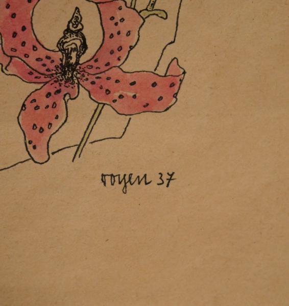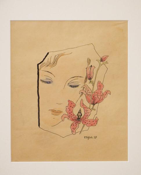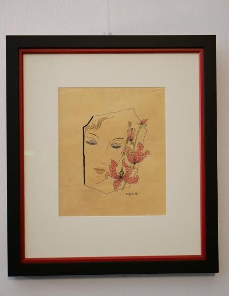citlivě provedená kresba dívčí tváře se stylizovanými květy orchideje, kresba tuší s akvarelem na papíru, rozměry 22,2 x18,7 cm, signováno a datováno ”Toyen 37”; pozdější rám; pěkná ukázka práce významné česko-francouzské malířky, představitelky evropského surrealismu; znalecký posudek; Marie Čermínová-TOYEN (1902 Praha -1980 Paříž)