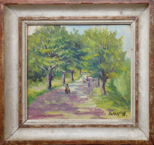 Olejová tempera na kartonu 28 cm x 31 cm. Signováno vpravo dole. Autor obrazu: Stanislav Lolek (1873-1936). Scenérie lidských postaviček míjejících se na cestě alejí v parku. Dobový světlý rám s okrovými linkami a sklem, rám nesoucí stopy mírného opotřebení. Československo 1920 - 1935. Celkový rozměr s rámem 41,5 cm x 44,5 cm.