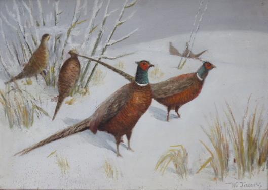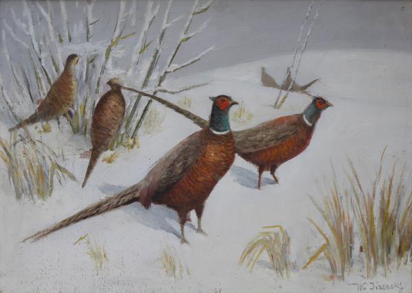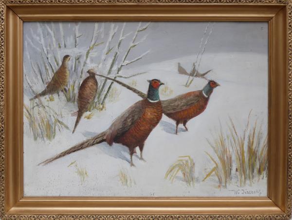 Olej na kartonu 50 cm x 69 cm. Signováno vpravo dole. Autor obrazu: Karel Walter Jizerský (nar. 1892). Zimní scenérie párů bažantů a koroptví na sněhové pláni. Originální zlatý rám s reliéfní zdobnou horní lištou. Na malbě místy tečky od hmyzu. Československo 1920 - 1940.
