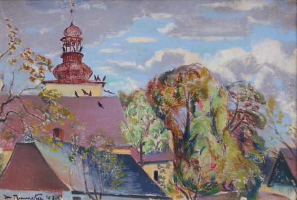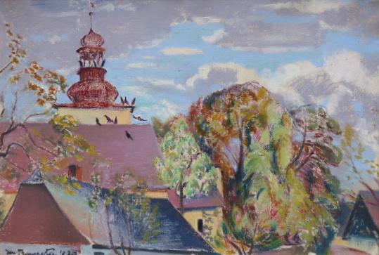 Olejový pastel na kartonu 72,5 cm x 103,5 cm. Signováno vpravo dole s datací 1925. Vzadu přípravná skica - kresba rudkou. Autor obrazu: Jan Trampota (1889-1942) si techniku olejového pastelu osvojil během svého studijního pobytu ve Francii. Pohled na věž goticko-renesančního Kostelu Nejsvětější Trojice v Rokytnici v Orlických horách. Originální stříbrný rám se zlatavou patinou a vnitřní zdobnou lištou. Československo, rok 1925. Celkový rozměr s rámem 86 cm x 118 cm.