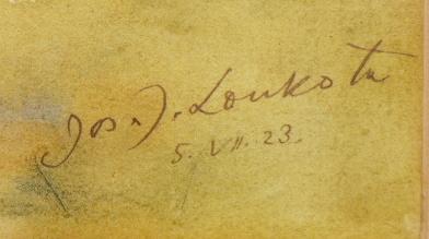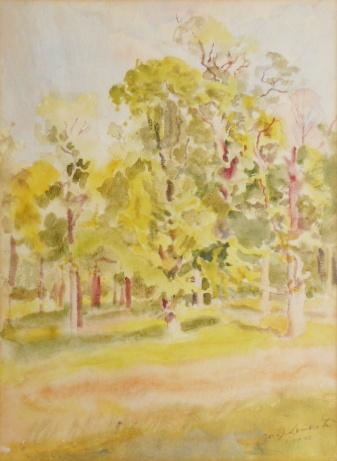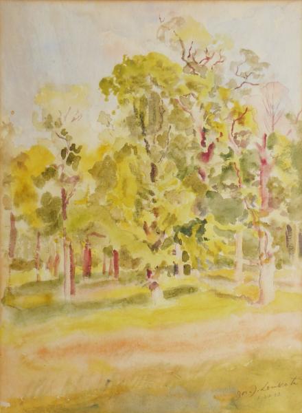 Akvarel na papíru 28 cm x 20 cm. Signováno vpravo dole s datací 5. VII. 1923. Autor: Josef Jindřich Loukota (1889-1963). Pohled na lesopark za letního dne. Zlatý patinovaný rámeček s paspartou a sklem. Z umělcovy rodinné pozůstalosti. Československo, rok 1923. Celkový rozměr s rámem 38,5 cm x 30,5 cm.