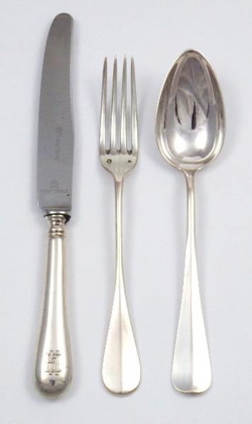 Stříbro, nerezová ocel. Ryzost Ag 800/1000, celková hmotnost 1.075 g. Výrobce: Sandrik, Dolné Hámre (lžíce, nože) a Josef Dworak, Vídeň (vidličky). Délka nožů 21,5 cm, délka vidliček a lžic 18,5 cm. Sada stříbrných příborů pro 6 osob složená ze lžic, vidliček a nožů. Nože a lžíce jsou na rukojetích dekorovány monogramem EH, vidličky monogramem H. Sada těchto příborů pochází z domácnosti národní umělkyně Eleny Holéczyové, textilní výtvarnice a zakladatelky národopisných krojových sbírek na Slovensku a jejího manžela MUDr. Ervína Holéczyho, lékaře a ředitele Evangelické nemocnice v Bratislavě, kde působil po konci druhé světové války. Byl rovněž spisovatelem píšícím pod pseudonymem Peter Zván. Čepel nožů je z nerezové oceli, značeno INOXYDABLE. Značeno: československý punc Tatry a kříž, ryzost 800, značka výrobce (rozeta) - nože a lžíce, vidličky značené rakousko-uherský vídeňský punc Diana a mistrovská značka. Československo, Dolné Hámre 1929 - 1941. Délka nožů 21,5 cm, délka vidliček a lžic 18,5 cm.