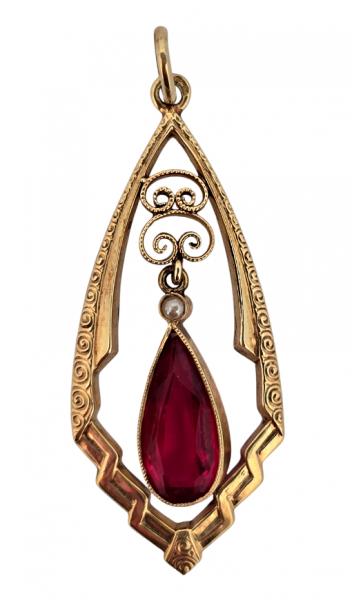 Popis: Starožitný secesní přívěsek ze žlutého zlata, s malou perličkou a rubínovým sklem. Krásně propracovaný, zdobený.
