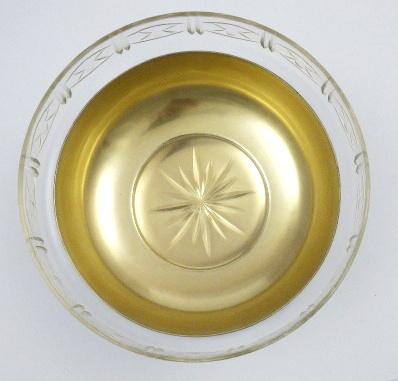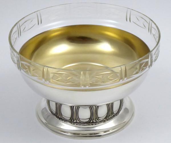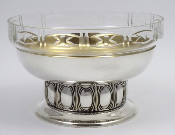 Postříbřený kov (alpaka), chinese silver, ručně broušené čiré sklo. Období a styl: secese. Výrobce: Justus Brenger & Co, Justinuswerk, Solingen-Wald, firma založená roku 1886. Celková hmotnost 1.259,8 g. Velmi zajímavá kulatá mísa z postříbřeného kovu se skleněnou vložkou. Vlastní mísa z alpaky je na vyvýšeném podstavci, jehož prostřední část je zdobená reliéfními festony. Skleněná vložka je na horním okraji dekorovaná ručně broušenými ornamenty kapek střídajících se s florálními motivy. Ve výborném stavu. Značeno zespodu: čísla, písmeno CH a značka výrobce. Německo, Solingen-Wald, 1895 - 1910. Průměr 24 cm, výška 15 cm.